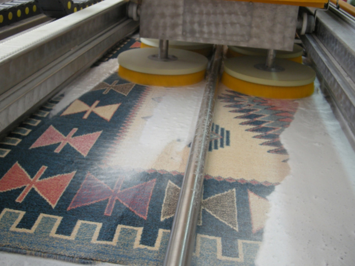 Dezenfekte edilen halılar otomatik makinalarda yıkamaya girmeden önce halı üzerindeki çıkması zor olan lekelere özel ilaçlarla lokal işlem uygulanmaktadır.